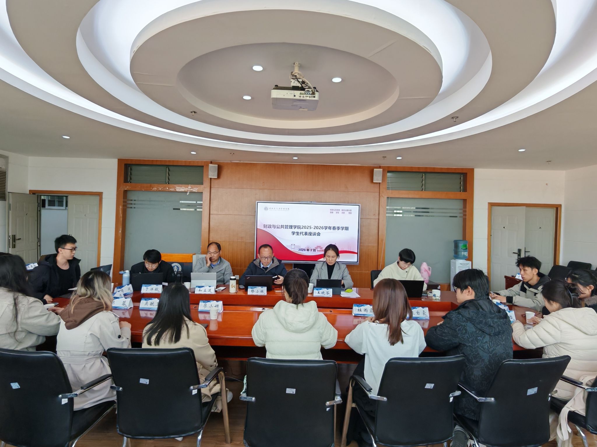 为进一步倾听师生心声,凝聚发展共识,3月4日,财政与公共管理学院在逸夫楼923会议室召开2025-2026学年春季学期师生代表座谈会。学院领导班子成员、学院教师及学生代表分阶段参加会议。
