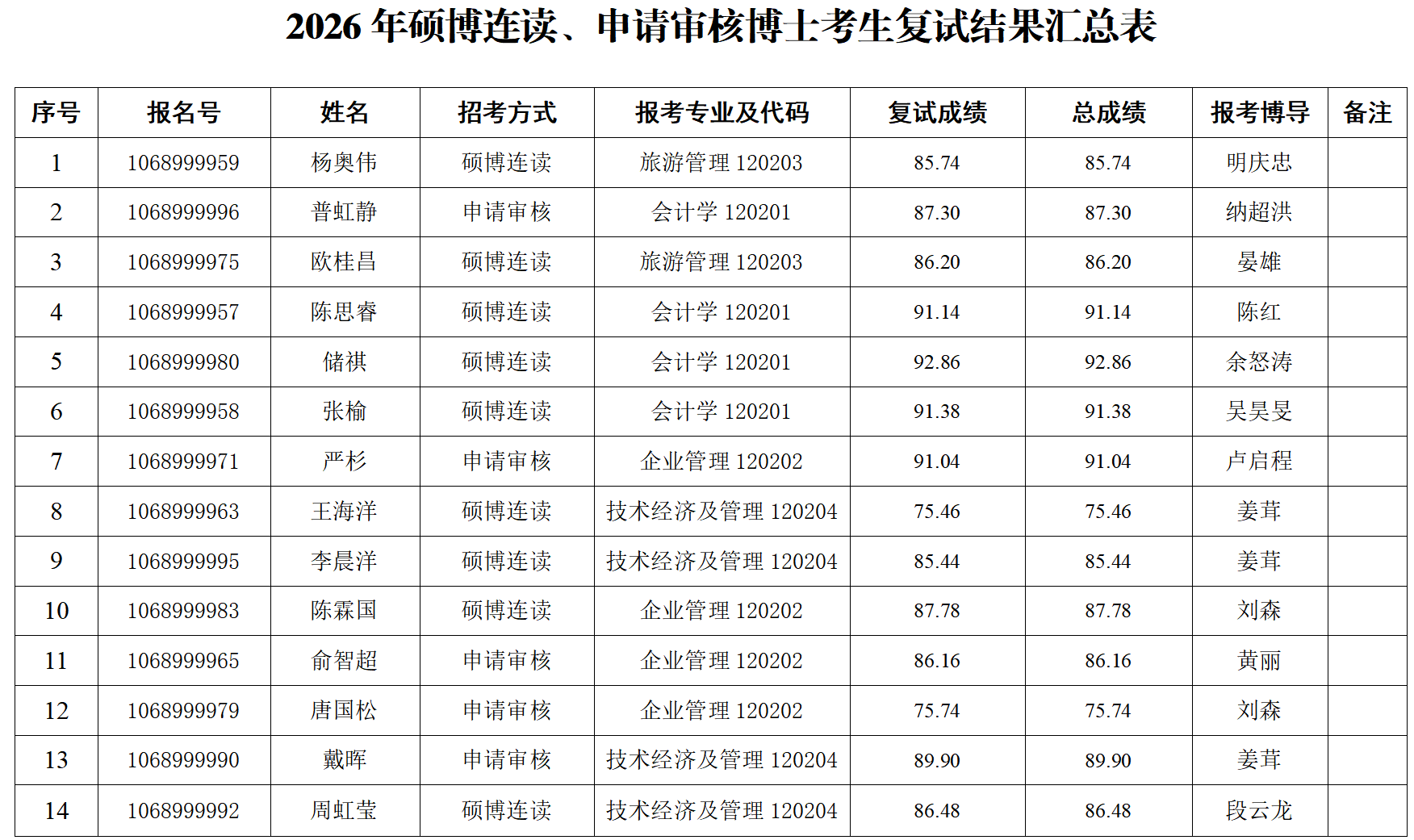 商学院2026年博士研究生招生考试硕博连读、申请审核复试工作现已结束,现将复试成绩、总成绩以及有关事项通知如下: