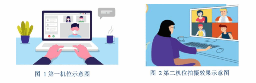 (二)考生需要准备可以支撑双机位运行的硬件,即需要两部带摄像头的设备及附件,包括电脑、手机、手机支架等。两个机位设备即电脑和手机摄像头像素不低于标清720P720*1280)。面试时,1台笔记本电脑或台式机或手机(具备音、视频输入、输出功能),用于面试设备,作为主机位1部手机或笔记本电脑或台式机或PAD等平板设备(须带有摄像头),用于监控面试环境的设备,作为辅机位。设备具体摆放要求如下: