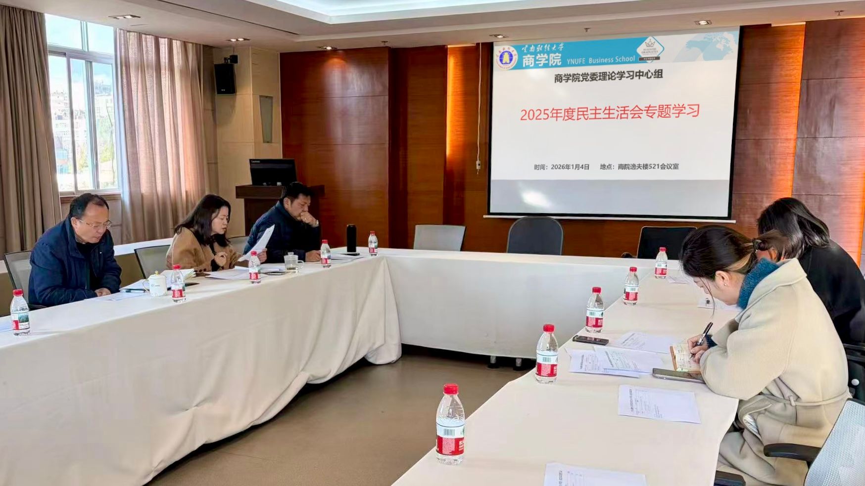 根据校党委关于开好2025年度民主生活会的工作要求,1月4日上午,商学院党委理论学习中心组2026年第一次集体学习(扩大)会暨2025年度民主生活会会前专题学习会议在逸夫楼521会议室举行。党委书记王敏主持并作领学。