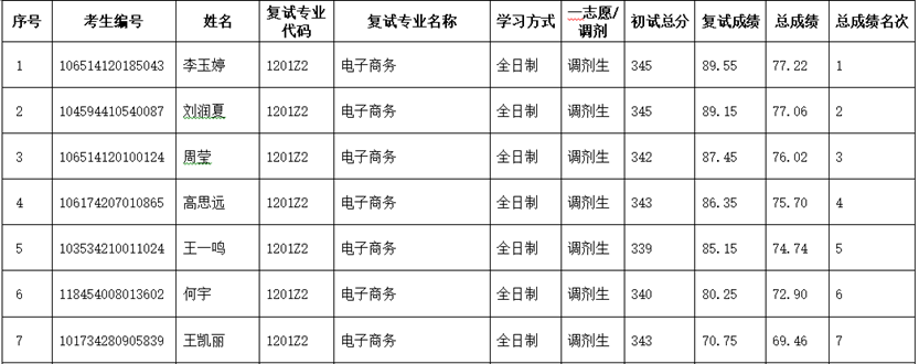 商学院2024年硕士研究生招生考试电子商务、企业管理、市场营销、技术经济及管理四个专业调剂考生复试工作现已结束,现将各专业复试成绩、总成绩以及有关事项通知如下。本通知同步在调剂考生复试QQ群公布。