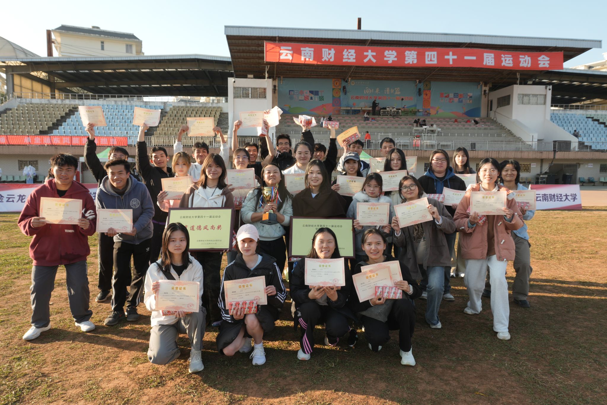 2025年11月26日至28日,云南财经大学第四十一届运动会顺利举行。商学院师生团结拼搏,以昂扬斗志展现学院风采,最终荣获团体总分第二名,团体操二等奖,“体育道德风尚奖”等多项佳绩。