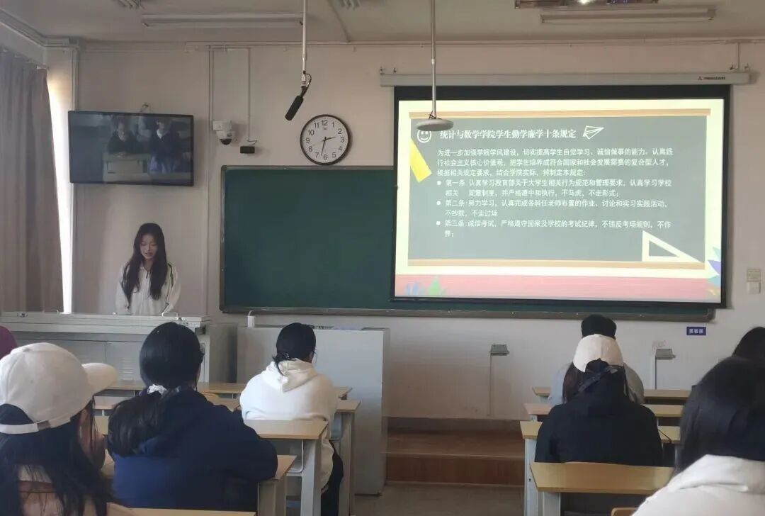 宣讲会上,学院相关负责人首先解读了《统计与数学学院学生勤学廉学十条规定》。该规定围绕学生学习、行为规范、个人修养等方面作出明确要求,其中第三条着重强调“诚信考试,严格遵守国家及学校的考试纪律,不违反考场规则,不作弊”。同时,负责人还对规定中关于认真完成学业任务、规范个人信息、参与学术活动等其他条款进行了说明,引导学生骨干带头践行社会主义核心价值观,做到勤学廉学、诚信做事。