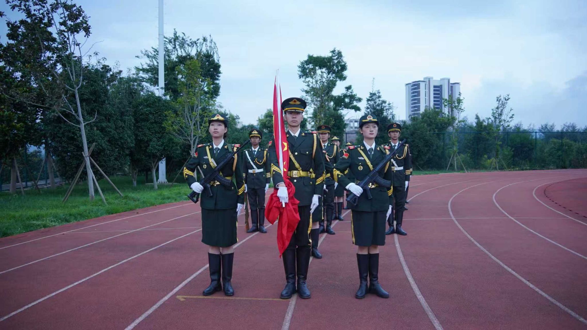 上午7时20分,国旗护卫队迈着铿锵有力的步伐护送国旗入场。伴随着雄壮的国歌声,五星红旗冉冉升起。