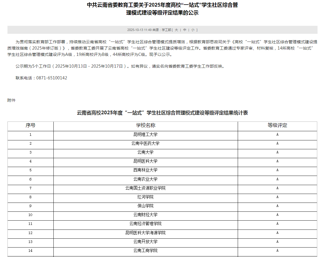 10月13日,中共云南省委教育工委公示了2025年高校“一站式”学生社区综合管理模式建设等级评定结果,云南财经大学凭借特色鲜明的建设路径与成效显著的育人实践,成功获评A级并进入公示,标志着学校在贯彻落实教育部关于“一站式”学生社区综合管理模式建设提质增效要求、深化学生社区治理改革方面取得突破性进展。
