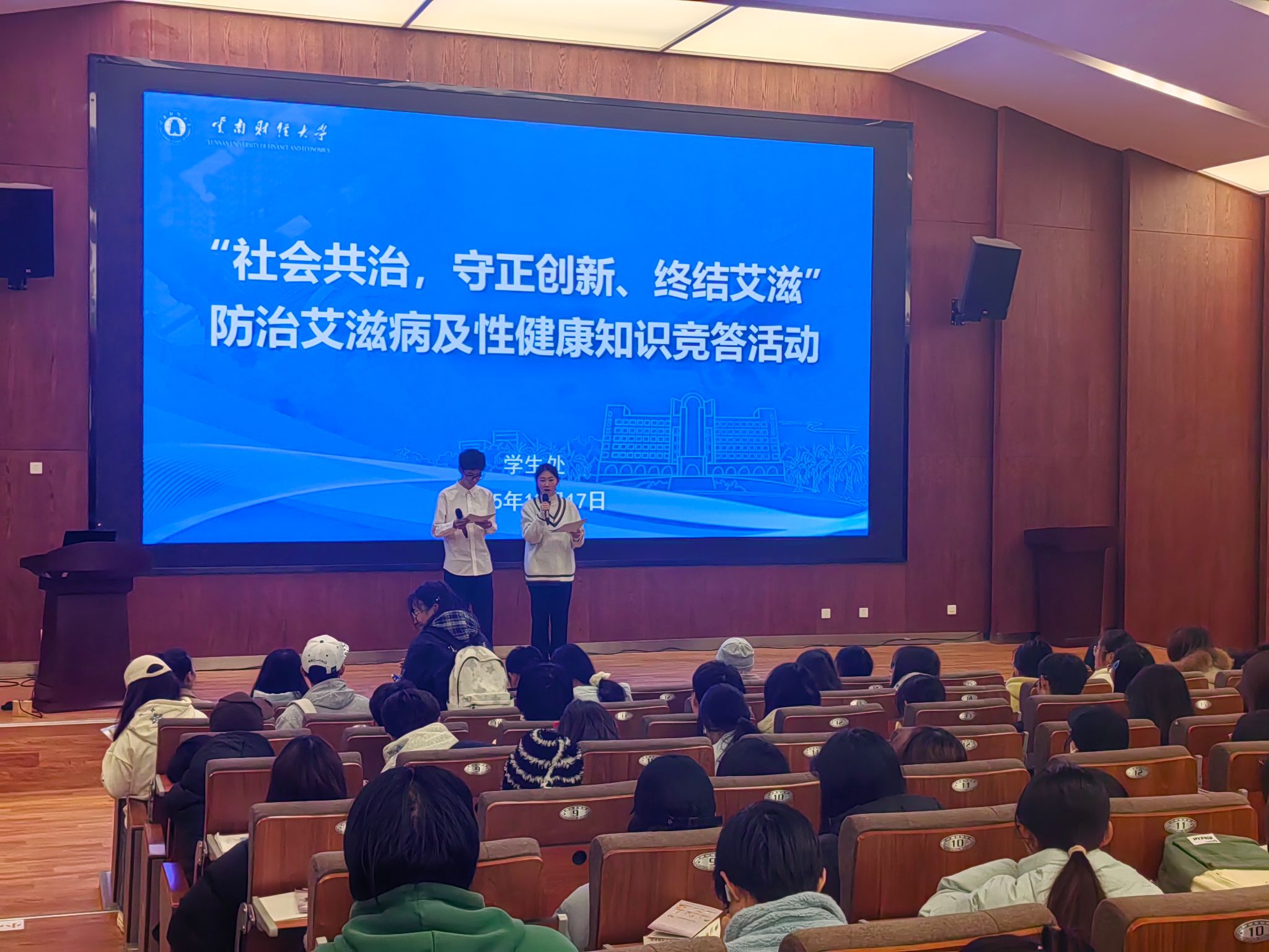 为进一步提升师生对艾滋病、梅毒和丙肝的防治意识,增强自我保护能力,营造健康安全的校园环境,12月17日,学校在安宁校区鹏云1阶梯教室报告厅举办防治艾滋病、梅毒及丙肝专题知识讲座暨防治艾滋病及性健康知识竞答活动。安宁市中医院皮肤诊疗中心詹冶颖和李彬彬老师应邀担任主讲,安宁校区各学院预防艾滋病及性健康骨干宣传队伍及师生代表200余人参加活动。