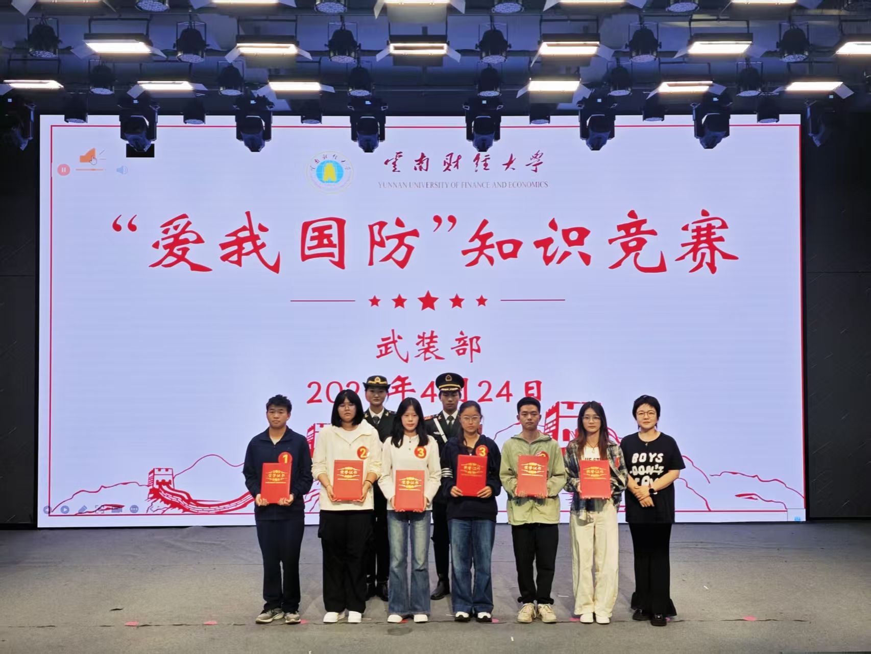 为深化国防教育,普及国防知识,激发云财学子爱国热情与国防意识,4月24日下午,云南财经大学2026年“爱我国防”知识竞赛决赛在龙泉路校区南院云彩“一站式”学生中心“大思政 小剧场”顺利落幕。经过线上预赛的筛选,7支队伍共21名选手从4000余名参赛选手中脱颖而出,齐聚决赛现场,以知识比拼筑牢国防观念,以青春担当诠释家国情怀。