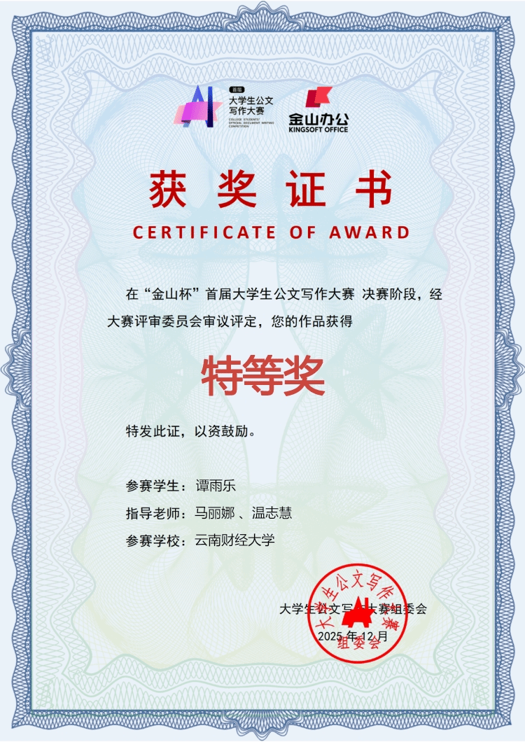 近日,“金山杯”首届大学生公文写作大赛决赛评审结果公布。中华职业学院秘书学专业2023级谭雨乐同学获西南赛区一等奖和全国决赛特等奖,其作品《青年赋能视角下曼德勒村文旅融合的实践探索》(指导教师:马丽娜、温志慧)同步入选“大学生百优调研报告”。