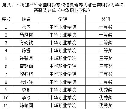 3月6日至22日,由云南财经大学图书馆主办的第八届“搜知杯”全国财经高校信息素养大赛校赛初赛圆满结束,中华职业学院共有11名学生获奖,是本次比赛获奖人数最多的学院。